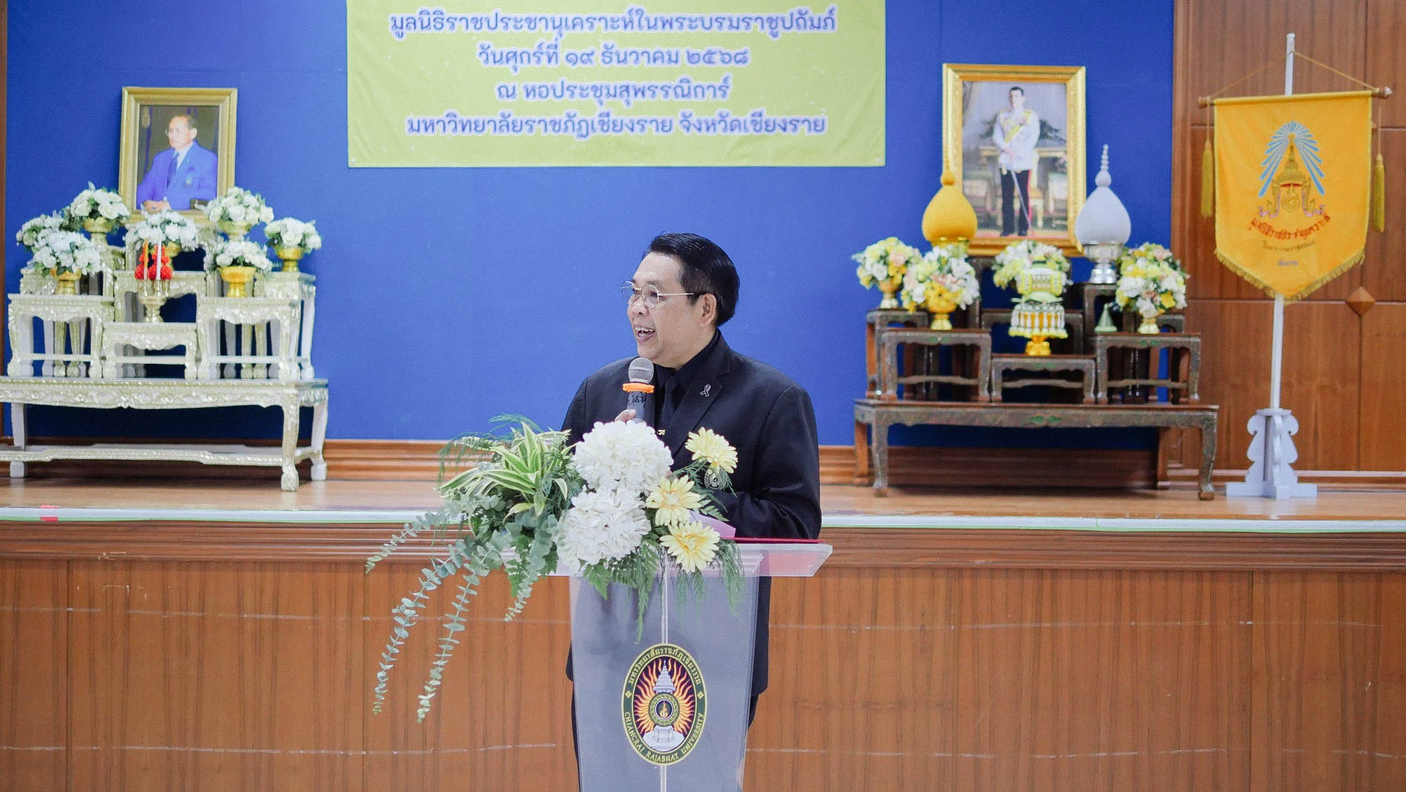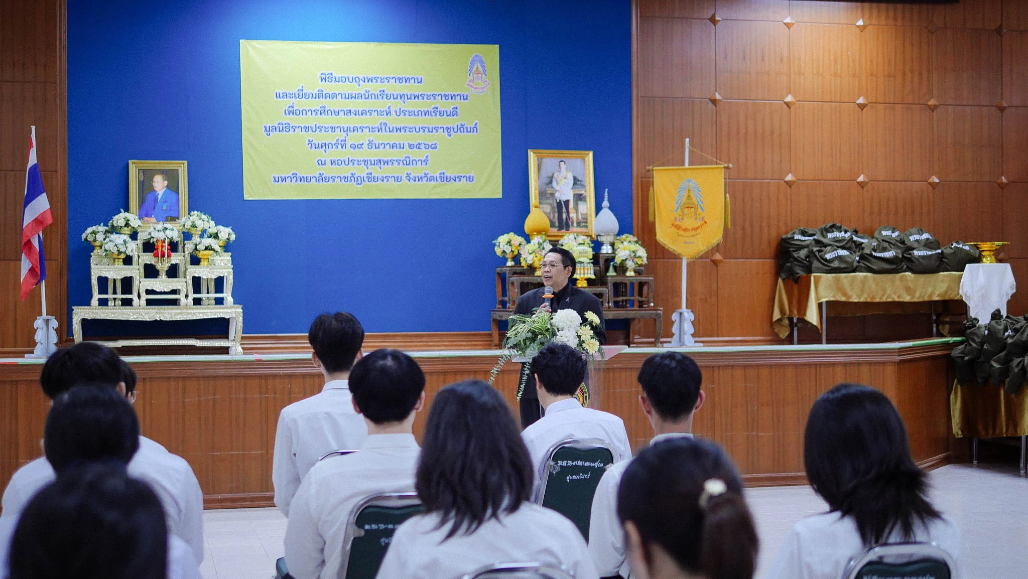 วันที่ 19 ธันวาคม 2568 มหาวิทยาลัยราชภัฏเชียงราย (มรภ.เชียงราย) โดย ผู้ช่วยศาสตราจารย์ ดร.จำรัส กลิ่นหนู รองอธิการบดีมหาวิทยาลัยราชภัฏเชียงราย กล่าวต้อนรับ นายประสงค์ หล้าอ่อน รองผู้ว่าราชการจังหวัดเชียงราย พร้อมด้วยคณะกรรมการและเจ้าหน้าที่มูลนิธิราชประชานุเคราะห์ ในพระบรมราชูปถัมภ์ และสำนักงานพัฒนาสังคมและความมั่นคงของมนุษย์จังหวัดเชียงราย ในพิธีมอบถุงพระราชทาน และการเยี่ยมติดตามผลนักเรียนทุนพระราชทานเพื่อการศึกษาสงเคราะห์ ประเภทเรียนดี