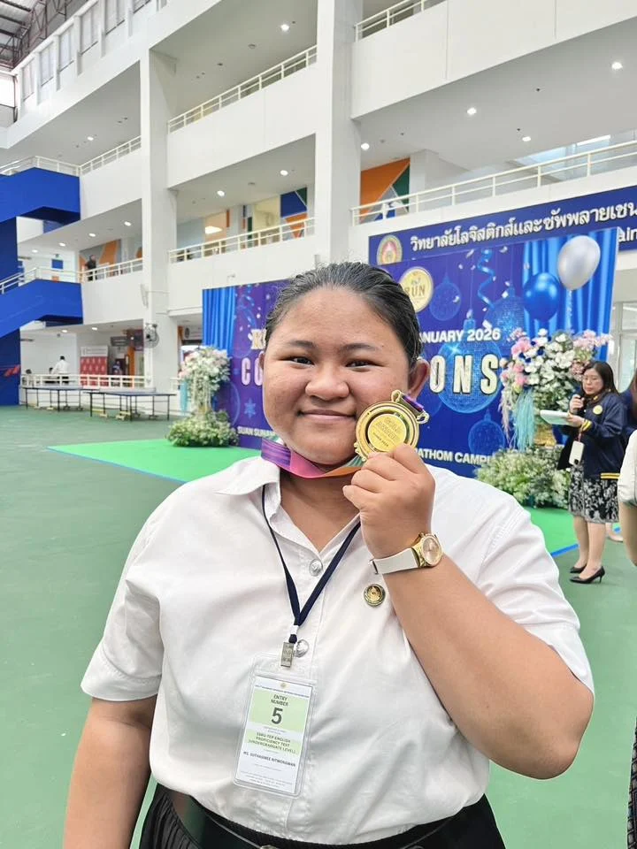 ในการนี้ นางสาวสุธาสินี กิจวงค์วาน นักศึกษาชั้นปีที่ 3 สาขาวิชาภาษาอังกฤษ คณะมนุษยศาสตร์และสังคมศาสตร์ มหาวิทยาลัยราชภัฏเชียงราย ได้แสดงศักยภาพด้านภาษาอังกฤษอย่างโดดเด่น จนสามารถคว้ารางวัล ชนะเลิศ (1st Prize – Gold Award) ซึ่งเป็นหนึ่งใน 25 รางวัลเหรียญทอง ที่มอบให้แก่ผู้มีผลการสอบยอดเยี่ยมในระดับประเทศ