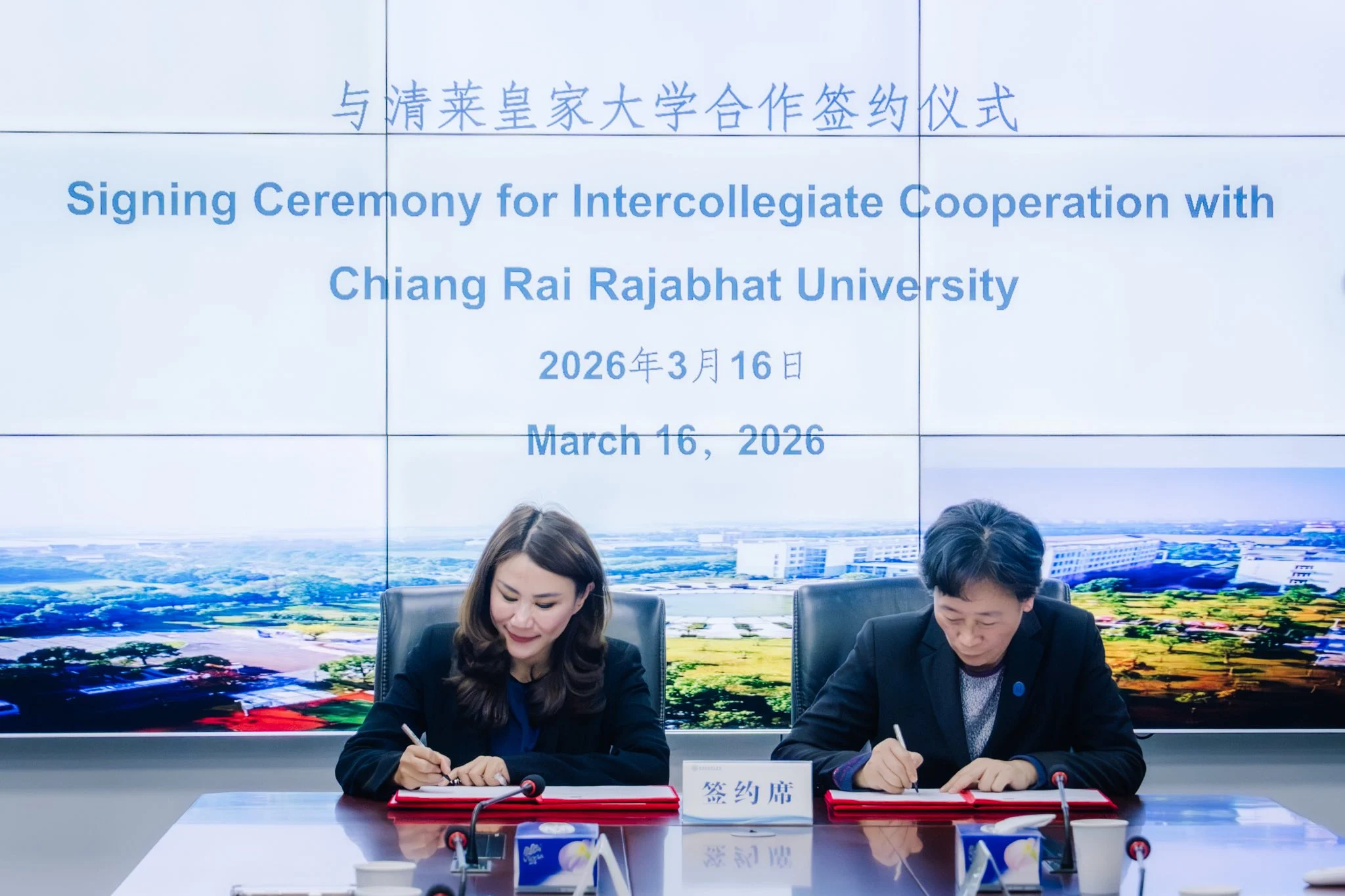 วันที่ 16 มีนาคม 2569 รองศาสตราจารย์ ดร.ไพโรจน์ ด้วงนคร อธิการบดีมหาวิทยาลัยราชภัฏเชียงราย มอบหมายให้ ผู้ช่วยศาสตราจารย์ ดร.สหัทยา สิทธิวิเศษ รองอธิการบดี ผู้รับผิดชอบงานด้านการจัดการศึกษาต่างประเทศ (จีน) เป็นผู้แทนมหาวิทยาลัยราชภัฏเชียงราย ลงนามความร่วมมือทางวิชาการกับ Shanghai Urban Construction Vocational College ณ นครเซี่ยงไฮ้ สาธารณรัฐประชาชนจีน